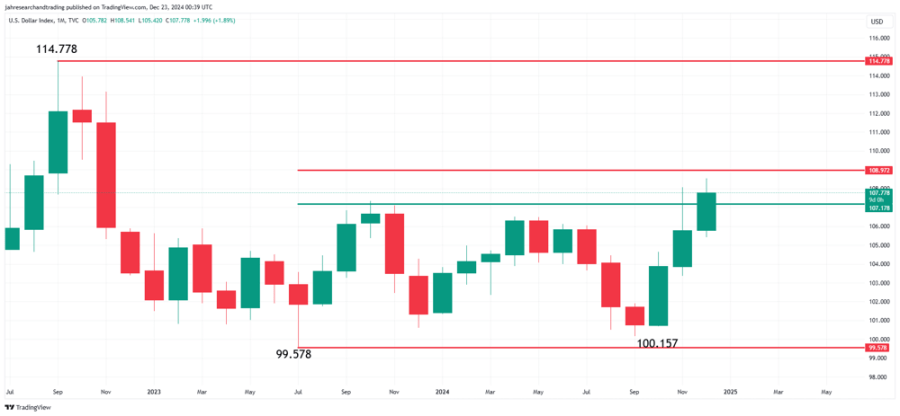 Figure 3: Monthly chart of the U.S. Dollar Index (DXY) with key support and resistance levels (July 2022–Dec 2024). After peaking at 114.78 in 2022, DXY fell to ~100 in mid-2023, then rebounded to the 107–108 zone by late 2024. Major resistance lies around 108–110, while the 99–100 area has acted as strong support in recent years :